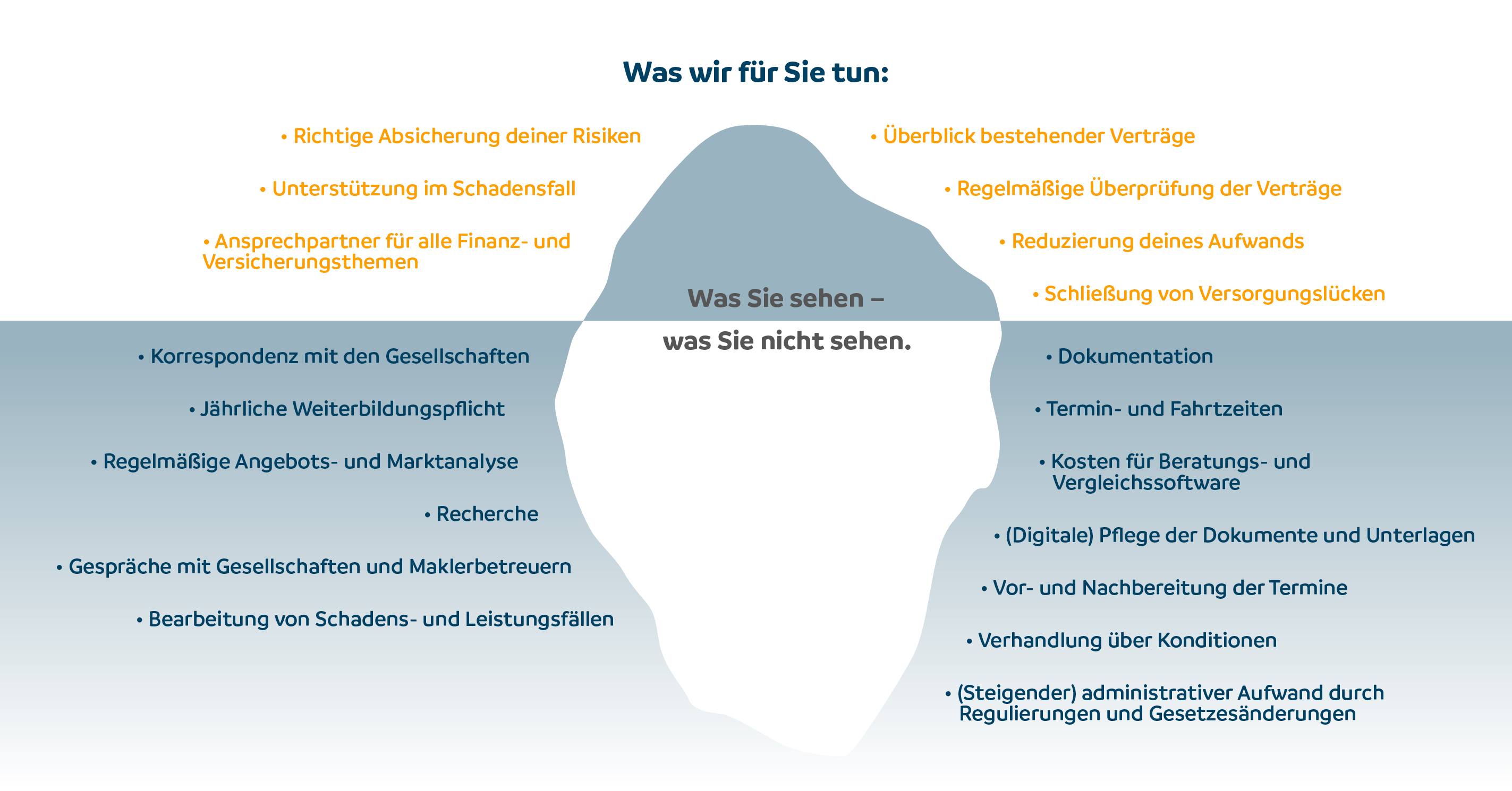 Vieles lief bisher im Hintergrund: Wir klären Schäden für Sie, prüfen Ihre Verträge regelmäßig, verhandeln mit Versicherern, organisieren Unterlagen für die Steuer, helfen Ihnen bei Patientenverfügung & Co., kümmern uns auch um Fremdverträge... Und das ist nur ein Teil davon.